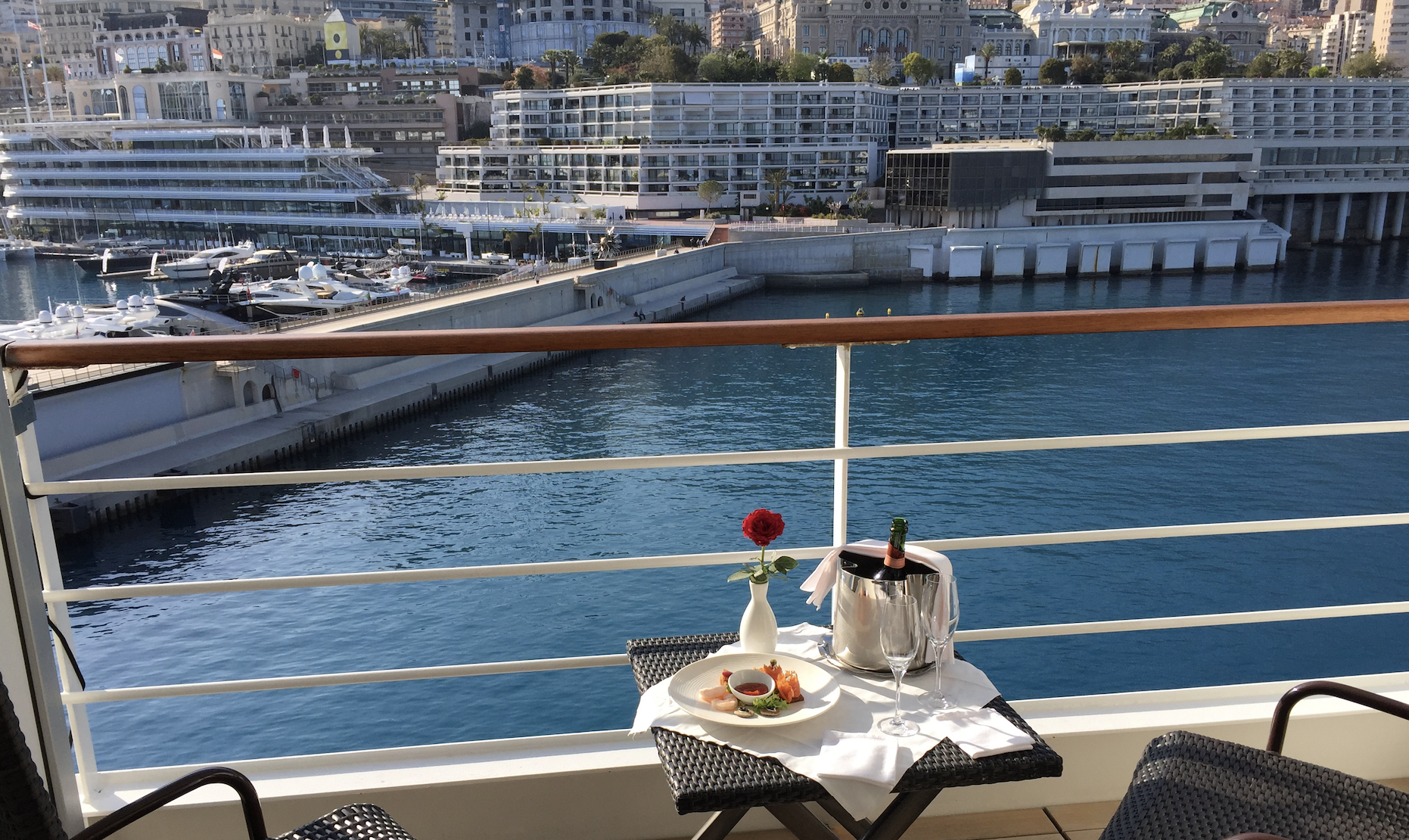 Champagne and canapes on the terrace of our Silversea cruise docked in Monte Carlo